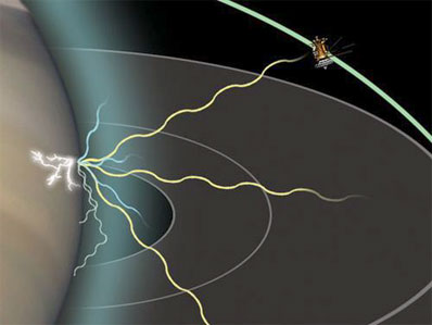 This artist concept shows how Cassini is able to detect radio signals from lightning on Saturn. Lightning strokes emit electromagnetic energy across a broad range of wavelengths, including the visual wavelengths we see and long radio wavelengths that cause static on an AM radio during a thunderstorm. Credit: