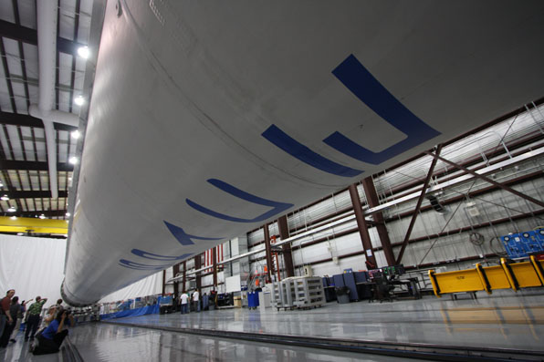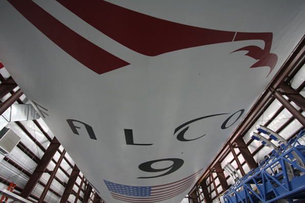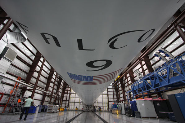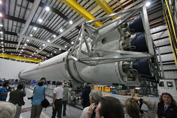 The SpaceX Falcon 9 rocket that will haul the company's Dragon spacecraft into orbit for rendezvous with the International Space Station in early 2012 is pictured here in its Cape Canaveral processing hangar at Complex 40 during a press photo opportunity  in late November.
