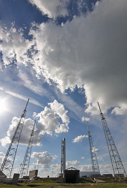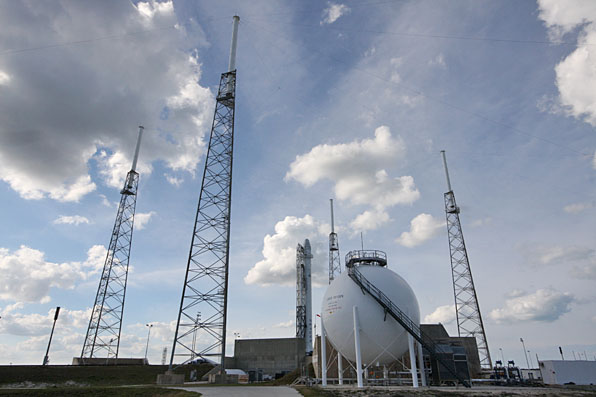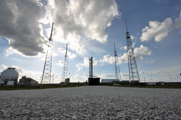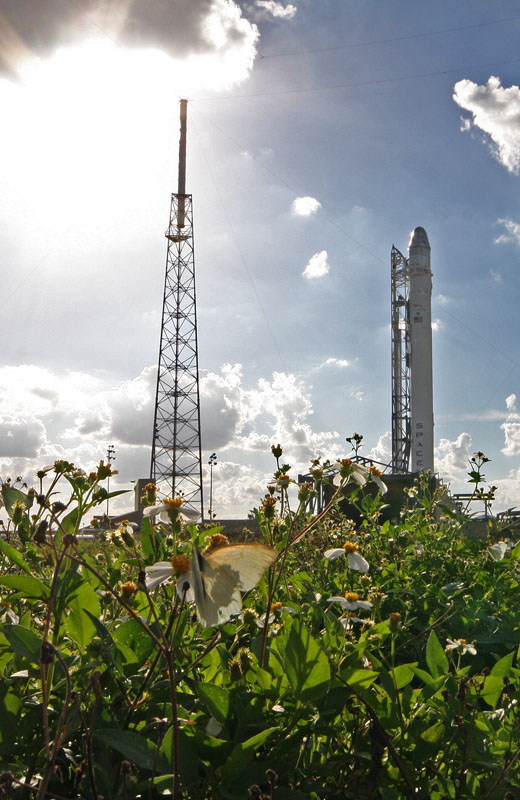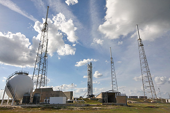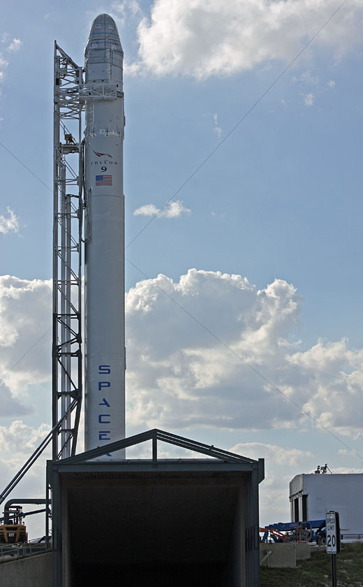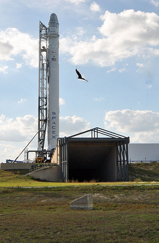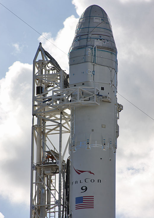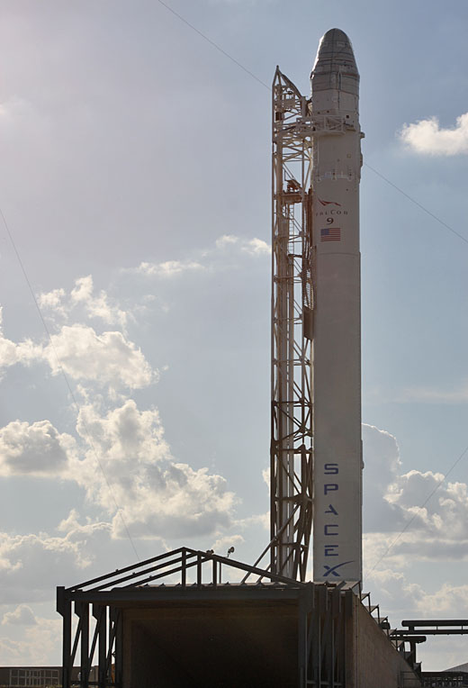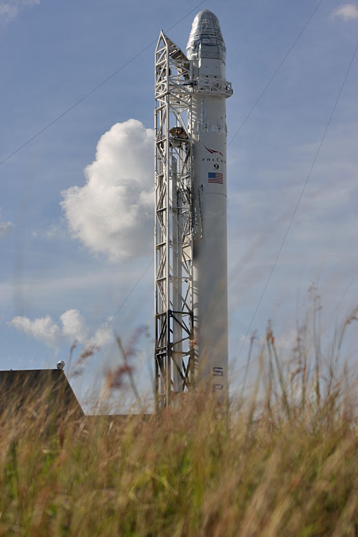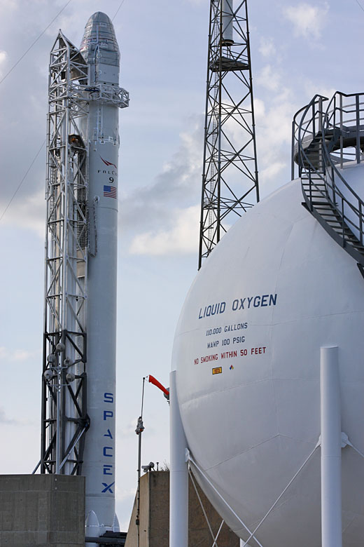 The Dragon capsule sits stop its SpaceX Falcon 9 booster rocket at Cape Canaveral's Complex 40 following a countdown dress rehearsal and fueling exercise to simulate launch day operations. Clocks ticked to T-minus 5 seconds before halting.
