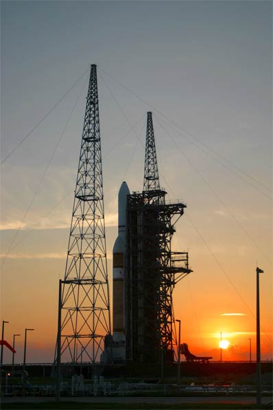 The mobile service tower is rolled back to expose Boeing's Delta 4-Heavy rocket at sunrise for the Wet Dress Rehearsal launch day simulation on October 26 at Cape Canaveral Air Force Station's pad 37B. Credit: Boeing photo by Carleton Bailie