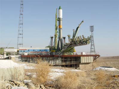 The Soyuz rocket topped by the Progress 17P ship was erected on the Baikonur launch pad over the weekend. Credit: Energia