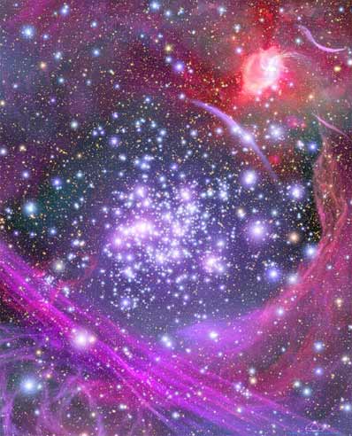 This artist's impression shows how the Arches star cluster appears from deep inside the hub of our Milky Way Galaxy. Although hidden from our direct view, the massive cluster lies 25,000 light-years away and is the densest known gathering of young stars in our galaxy. The illustration is based on infrared observations with Hubble and with ground-based telescopes, which pierced our galaxy's dusty core and snapped images of the luminous cluster of about 2,000 stars. Credit: NASA, ESA and A. Schaller (for STScI)