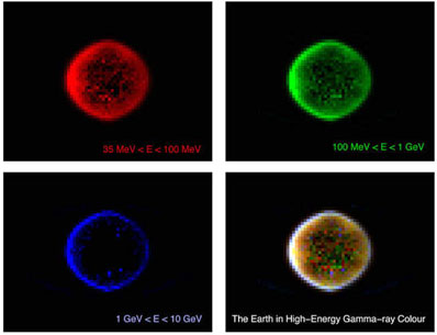 Here we see a false-color image of the Earth in three gamma-ray energy bands, analogous to the colors red (lower energy), green (mid energy) and blue (higher energy) in the visible spectrum. For the complete caption and print-resolution versions, see the links at the end of this article. Credit: NASA/CGRO/EGRET/ Dirk Petry