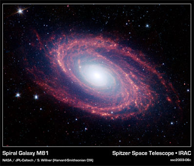 NASA Spitzer Space Telescope image of the spiral galaxy M81, located some 12 million light years from Earth. The infrared radiation emitted by polycyclic nitrogen-containing aromatic hydrocarbon (PANH) molecules is shown in red. This emission is excited by star (and planet) formation along the edges of the spiral arms.