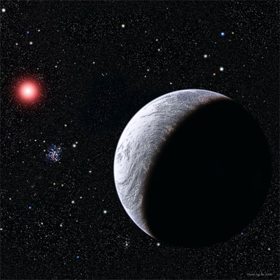 This artist's rendering shows a rocky iceball several times heavier than Earth orbiting a red dwarf star. Astronomers believe that some "super-Earths" form in a cosmic "snowstorm," collecting huge amounts of ices from the protoplanetary disk in which they formed. Credit: David A. Aguilar (CfA)