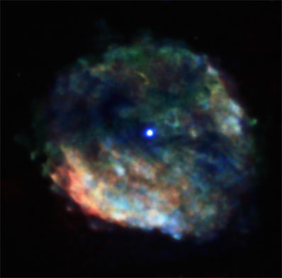 A new X-ray image shows the 2,000 year-old-remnant of such a cosmic explosion, known as RCW 103, which occurred about 10,000 light years from Earth. In Chandra's image, the colors of red, green, and blue are mapped to low, medium, and high-energy X-rays. At the center, the bright blue dot is likely the neutron star that astronomers believe formed when the star exploded.