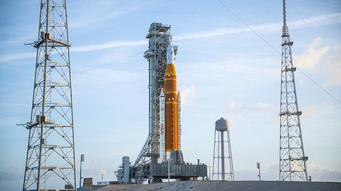 The rollout of the 322-foot-tall rocket took fewer than 12 hours after first motion, which occurred at about 12:20 a.m. EDT (0420 UTC). NASA hopes to launch the crewed test flight to the Moon no earlier than April 1.