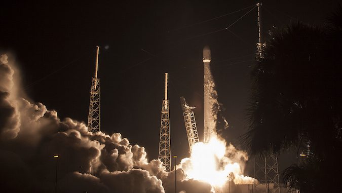 Vaulting into a starry sky over Florida’s Space Coast, a SpaceX Falcon 9 rocket successfully took off early Sunday with a Japanese video and data relay satellite, then stuck a landing on a barge stationed nearly 400 miles east of Cape Canaveral.