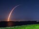 Launch occurred shortly after sunset, and the Falcon 9’s expanding exhaust plume caught beams of sunlight as it soared above the stratosphere.