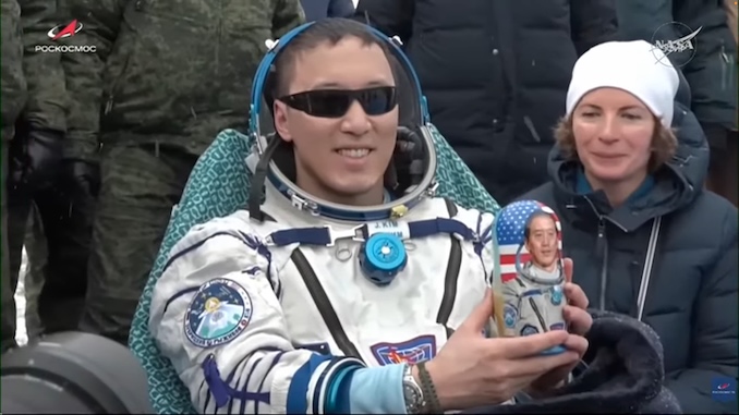Briefly resting in a nearby recliner as is traditional for returning Soyuz crew members, Kim appeared healthy and in good spirits, smiling his thanks after Russian recovery crews presented him with a nested matryoshka doll with his face painted on the outermost shell.