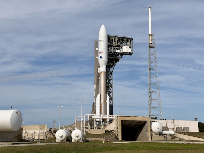 On Saturday morning, ULA rolled its 205-foot-tall (62.5 m) rocket, designation AV-111, out of the Vertical Integration Facility to begin the journey of a third of a mile to the pad. It was lowered onto the launch pad piers and completed “hard down” at 11:51 a.m. EST (1651 UTC). Later that day 25,000 gallons of rocket-grade kerosene were loaded onto the first-stage booster.