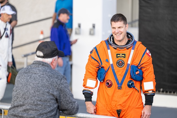 Astronauts Reid Wiseman, Victor Glover, Christina Koch and Jeremy Hansen departed the Neil Armstrong Operations and Checkout Building at around 12:20 p.m. EST (1720 UTC), sporting their orange pressure suits, for a 5.5-mile journey to the Vehicle Assembly Building where the Space Launch System rocket and their Orion Capsule was waiting for them. After a few minutes of remarks to stand-ins for their family members and other NASA officials gathered outside, the crew boarded their transport vehicle and hit the road.