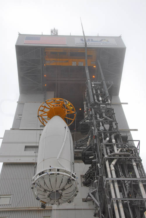 Atlas 5 rocket assembled for launch This collection of photographs shows the Atlas 5 rocket's payload, already encapsulated in the five-meter-diameter nose cone, being hoisted atop the launcher at Vandenberg Air Force Base's SLC-3 pad for the NROL-41 mission. Photo credit: United Launch Alliance