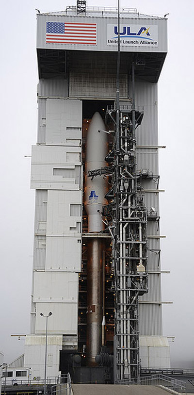Atlas 5 rocket awaits countdown The Atlas 5 rocket stands enclosed within its protective mobile service gantry on Sunday afternoon, just one day before the scheduled launch from Vandenberg Air Force Base, California. Photo credit: Gene Blevins/LA Daily News