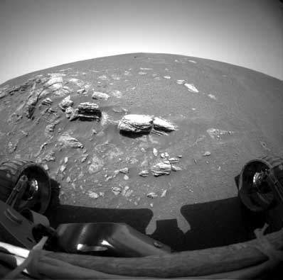 "We completed that drive and the post-drive imagery indicated the targets were within the work volume of the arm." On the sol 15 day that begins early Sunday morning (U.S time), the arm will be deployed again to snap several Microscopic Imager pictures of Snout and then place Mossbauer down on the rock. Late in the day, the Alpha Particle X-Ray Spectrometer will take over, performing an overnight observation. Early Monday morning, the arm will be retracted so Opportunity can begin an arcing drive around the lower edge of the outcrop to survey several points, Wallace said. "The science team is deciding how many 'bus stops' we want to hit along the way. I think the number is varying anywhere between three to six-or-seven. The total traverse distance is on the order of 30 meters. If we hit five'ish spots, we are looking at five or six meters per drive."
