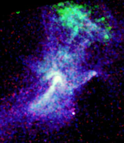 The features seen with Chandra give the scientists insight into the process by which voltages of more than 7000 trillion volts are created around rotating neutron stars (the dense remnants of supernova explosions) and how these extreme voltages affect their environment. B1509-58 is of particular interest because it has a much stronger magnetic field than the Crab Nebula pulsar, which exhibits similar features on a much smaller scale. The general picture emerging from these results is that high-energy particles of matter and antimatter are streaming away from the neutron star along its poles and near its equator. The particles leaving the poles produce the jets; astronomers speculate that only one side of the jet is apparent in B1509-58, indicating that this one side is beamed in our direction, while the other is rushing away. "Until this observation, no one knew for sure whether such tremendous voltages and energy outputs were a trademark of all pulsars, or if the Crab was an oddball," said Vicky Kaspi of McGill University in Montreal. "Now thanks to Chandra, it is becoming clear that pulsars are stupendous cosmic power plants." The arcs are thought to be due to shock waves in matter flowing away from the equator of the pulsar. By measuring the position and width of these arcs, the team estimated the intensity of the magnetic field, and the rate at which the pulsar is pumping high-energy particles into the space around it. "The X-ray images give us evidence that the pulsar not only accelerates particles efficiently," said Jonathan Arons of the University of California at Berkeley, "but it gives them energy comparable to the highest energies found in the cosmic rays which continuously bombard the Earth." In addition, the team determined that a bright cloud of X-ray emission about 25 light years from the pulsar is due to multi-million degree gas. This hot cloud was probably produced as material ejected by the supernova collided with cooler gas in interstellar space. Other members of the B1509-58 research team included Michael Pivovaroff (ThermaWave Inc), Nobuyuki Kawai (Tokyo Institute of Technology) and Keisuke Tamura (Nagoya University). Chandra observed B1509-58 with its Advanced CCD Imaging Spectrometer (ACIS) instrument, which was developed for NASA by Pennsylvania State University, University Park, and Massachusetts Institute of Technology, Cambridge. NASA's Marshall Space Flight Center in Huntsville, AL, manages the Chandra program, and TRW, Inc., Redondo Beach, CA, is the prime contractor for the spacecraft. The Smithsonian's Chandra X-ray Center controls science and flight operations from Cambridge, MA.