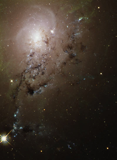 These images, taken with Hubble's Wide Field Planetary Camera 2 (WFPC2), show traces of spiral structure accompanied by dramatic dust lanes and bright blue regions that mark areas of active star formation. Detailed observations of NGC 1275 indicate that the dusty material belongs to a spiral system seen nearly edge-on in the foreground. The second galaxy, lying beyond the first, is actually a giant elliptical with peculiar faint spiral structure in its nucleus. These galaxies are believed to be colliding at over 6 million miles per hour. NGC 1275 is about 235 million light-years away in the constellation Perseus. Embedded in the center of a large cluster of galaxies known as the Perseus Cluster, it is also known to emit a powerful signal at both X-ray and radio frequencies. The galaxy collision causes the gas and dust already existing in the central bright galaxy to swirl into the center of the object. The X-ray and radio emission indicates the probable existence of a black hole at the bright galaxy's center. While the dark dusty material in the Hubble image falls inward, NGC 1275 displays intricate filamentary structures at a much larger scale outside the image. This is a typical feature of bright cluster galaxies. Additional observational evidence of strong interactions between at least two galaxies, and possibly a few smaller galaxies, includes the formation of new stars and large star clusters. Although similar in shape to the old globular clusters in the Milky Way galaxy, NGC 1275's clusters are much younger and contain 100,000 to a million stars each. This image was created from archived blue and red Hubble WFPC2 data taken in 1995 by John Trauger (JPL) and Jon Holtzman (NMSU). The Hubble Heritage team, along with collaborators Megan Donahue, Jennifer Mack, and Mark Voit (STScI), took follow-up WFPC2 observations at infrared wavelengths in 2001 to help produce this full-color image. The Space Telescope Science Institute (STScI) is operated by the