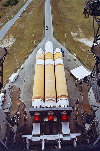 The first Boeing Delta 4-Heavy rocket was erected vertically at pad 37B on December 10, one day after rolling horizontally to the Cape Canaveral complex. Credit: Boeing