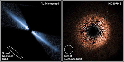 [LEFT: AU Microscopii] - A visible-light image of a debris disk around the red dwarf star AU Microscopii. Planets may be forming, or might already exist, within it. The disk glows in starlight reflected by tiny grains of dust created by the collisions of asteroids and comets. [RIGHT: HD 107146] - This is a false-color view of a planetary debris disk encircling the star HD 107146, a yellow dwarf star very similar to our Sun, though it is much younger (between 30 and 250 million years old, compared to the almost 5 billion years age of the Sun). The star is 88 light-years away from Earth. This is the only disk to have been imaged around a star so much like our own. Credit: NASA/ESA/J.E. Krist (STScI/JPL) & D.R. Ardila (JHU) Download larger image version here