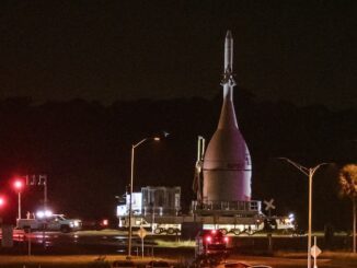 Teams at Stennis Space Center in Mississippi removed the core of NASA’s first Space Launch System heavy-lift rocket from a test stand earlier this week for loading onto a barge to carry it to Kennedy Space Center in Florida, where the rocket stage is due to arrive by the end of the month to start final preparations for a test flight around the Moon.