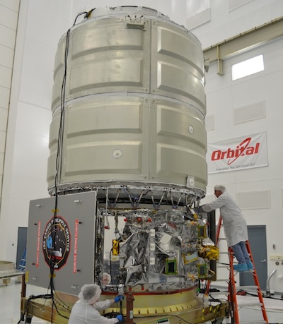 "It's ready to be transferred into the horizontal integration facility, and as soon as the rocket is ready to receive it, we will integrate the two together and it will be ready to roll out to the pad some time this summer - probably late June or early July," Culbertson said. "So we will be on track for delivery, assuming the space station schedule can accommodate us, and we don't run into any unforeseen problems." In March, technicians packed 1,235 pounds of cargo into the craft's Italian-built main cabin, then engineers mated the pressurized compartment to the Cygnus service module. Earlier this month, workers filled the spaceship's tanks with propellant. "The spacecraft will not be the long pole in getting to the pad," Culbertson said. "It will be just evaluating the pad condition to see what we have to do to refurbish it, if anything, and then getting the next core completely assembled with its engines, the second stage, and get the fairing in here so we can assemble and attach the spacecraft to the front end, and then roll it out." Workers will add some additional cargo, including fresh food, into the Cygnus spacecraft before it rolls to the launch pad. The Cygnus freighter's cargo section is based on the multi-purpose logistics modules used by NASA to ferry supplies to and from the space station in the space shuttle era. Orbital devised the Cygnus service module using a design proven on the company's geostationary communications satellites. While Orbital paid for the development of the Antares rocket with private financing, the company funded work on Cygnus jointly with NASA. Orbital started working on the Antares rocket in early 2007, and the firm won public funding from NASA in February 2008.