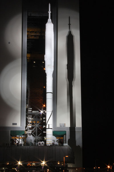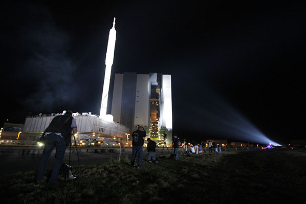 The Ares 1-X begins the journey from the Vehicle Assembly Building to Kennedy Space Center's launch pad 39B in preparation for its experimental rocket test flight. The trek began at 1:39 a.m. EDT on October 20.