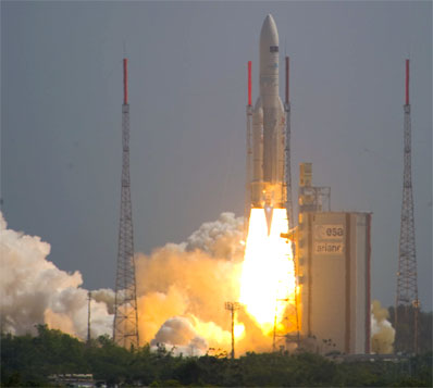 ![]() Ariane 5 rocket launches double science payload BY STEPHEN CLARK SPACEFLIGHT NOW Posted: May 14, 2009 An Ariane 5 launcher rocketed through blue skies and into space Thursday with two European telescopes designed to give scientists unprecedented views of star birth and the relic light from the Big Bang.