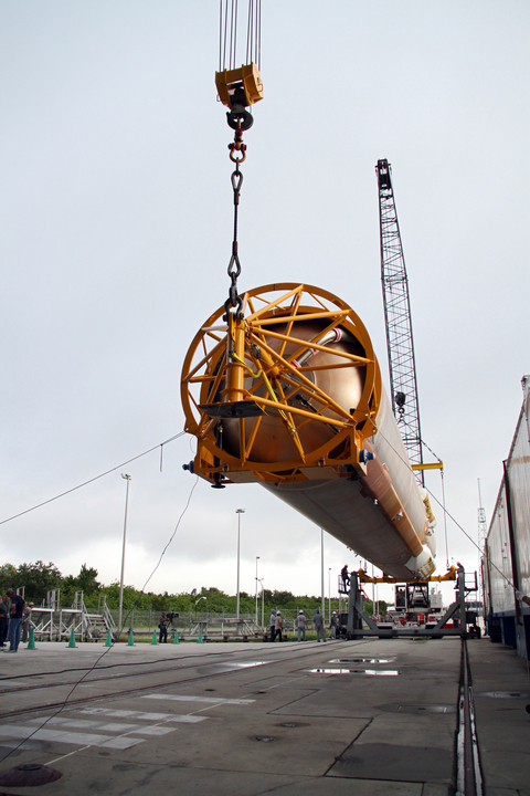 Workers trucked the 106-foot-long first stage of the Atlas 5 rocket Thursday from the Atlas Spaceflight Operations Center to Complex 41, the seaside launch pad from which Atlas vehicles blast off with payloads for the U.S. military and NASA.
