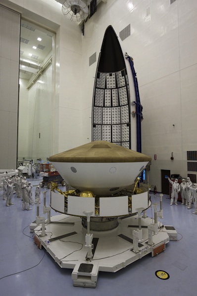 The spacecraft arrived at the Atlas 5 rocket's Vertical Integration Facility at 4:35 a.m. EDT (0835 GMT), then cranes began lifting the five-meter payload fairing about four hours later. It was in position above the rocket's Centaur upper stage by about 10 a.m. EDT (1400 GMT). Workers planned to make mechanical and electrical connections between the rocket and the payload later Thursday. High winds in Central Florida foiled the Mars Science Laboratory's move to the launch pad Wednesday, but conditions improved and were acceptable for the trip Thursday. David Gruel, the manager in charge of preparing MSL for launch, said the one-day delay going to the pad will mean teams will work Saturday to catch up. That leaves at least one full day of slack to deal with any potential problems between now and launch. Engineers finished assembling components of the MSL spacecraft Oct. 11 inside a decontaminated clean room at KSC. The rover and its rocket-powered landing stage are buttoned up inside an armored atmospheric entry capsule. Since then, crews checked the electrical connectivity of the entire vehicle, mated connectors and prepared wiring harnesses for flight. The team also loaded propellant into the cruise stage, which will guide the spacecraft on the journey from Earth until entry into the Martian atmosphere.
