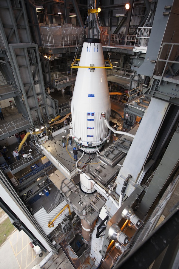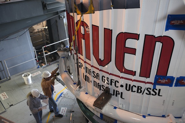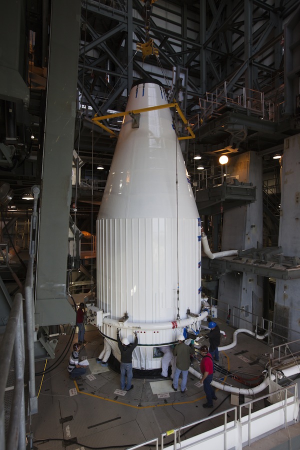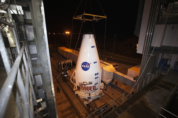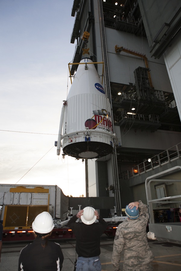 United Launch Alliance hooked up a crane to the top of MAVEN's payload fairing and hoisted the spacecraft inside the Atlas 5's Vertical Integration Facility, and technicians completed the initial attachment of MAVEN to its launch vehicle at 7:45 a.m. EST, according to NASA.