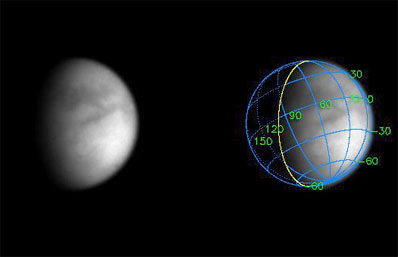 This view represents an improvement in resolution of nearly three times over the previous Cassini images of Titan. Titan's surface is difficult to study, veiled by a dense hydrocarbon haze that forms in the high stratosphere as methane is destroyed by sunlight. This image is different from previous Titan images by Cassini because it was taken through a special filter, called a polarizer, which is designed to see through the atmosphere to the surface. The superimposed coordinate system grid in the accompanying image at right illustrates the geographical regions of the moon that are illuminated and visible, as well as the orientation of Titan. North is up and rotated 25 degrees to the left. The yellow curve marks the position of the boundary between day and night on Titan. This image shows about one quarter of Titan's surface, from 0 to 70 degrees West longitude, and just barely overlaps part of the surface shown in the previous Titan image release. Most of the visible surface in this image has not yet been shown in any Cassini image. The image was obtained with the narrow angle camera on June 14, 2004, at a phase, or Sun-Titan-spacecraft, angle of 61 degrees and at a distance of 10.4 million kilometers (6.5 million miles) from Titan. The image scale is 62 kilometers (39 miles) per pixel. The image was magnified by a factor of two using a linear interpolation scheme. No further processing to remove the effects of the overlying atmosphere has been performed. The observed brightness variations are real, on scales of one hundred kilometers or less. The image was obtained in the near-infrared (centered at 938 nanometers) through a polarizing filter. The combination was designed to reduce the obscuration by atmospheric haze. The haze is more transparent at 938 nanometers than at shorter wavelengths, and light of 938 nanometers wavelength is not absorbed by methane gas in Titan's atmosphere. Light at this wavelength consequently samples the surface, and the polarizer blocks out light scattered mainly by the haze. This is similar to the way a polarizer, put on the front of a lens of a hand-held camera, makes distant objects more clear on Earth. Cassini will conduct a critical 96-minute burn before going into orbit around Saturn on June 30 (July 1 Universal Time), with its first scheduled flyby of Titan on July 2. The Cassini-Huygens mission is a cooperative project of NASA, the European Space Agency and the Italian Space Agency. The Jet Propulsion Laboratory, a division of the California Institute of Technology in Pasadena, manages the Cassini-Huygens mission for NASA's Office of Space Science, Washington, D.C. The Cassini orbiter and its two onboard cameras were designed, developed and assembled at JPL. The imaging team is based at the Space Science Institute, Boulder, Colo. |