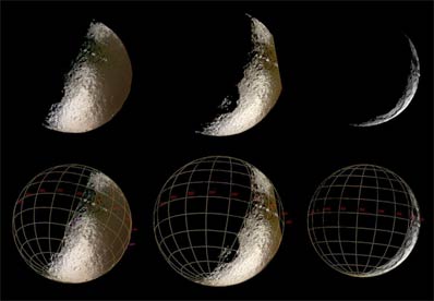 These are the sharpest views of Iapetus from Cassini so far, and they represent better resolution than the best images of this moon achieved by NASA's Voyager spacecraft. Images obtained using ultraviolet (centered at 338 nanometers), green (568 nanometers) and infrared (930 nanometers) filters were combined to produce the enhanced color views at left and center; the image at the right was obtained in visible white light. The images on the bottom row are identical to those on top, with the addition of an overlying coordinate grid. These views show parts of the moon's anti-Saturn side--the side that faces away from the ringed planet--which will not be imaged again by Cassini until Sept., 2007. In the central view, part of the moon's eastern edge was not imaged and appears to be cut off. With a diameter of 1,436 kilometers (892 miles), Iapetus is Saturn's third largest moon. It is famous for the dramatic contrasts in brightness on its surface--the leading hemisphere is as dark as a freshly-tarred street, and the trailing hemisphere and poles almost as bright as snow. Many impact craters can be seen in the bright terrain and in the transition zone between bright and dark, and for the first time in parts of the dark terrain. Also visible is a line of mountains that appear as a string of bright dots in the two color images at left, and on the eastern limb in the image at right. These mountains were originally detected in Voyager images, and might compete in height with the tallest mountains on Earth, Jupiter's moon Io and possibly even Mars. Further observations will be required to precisely determine their heights. Interestingly, the line of peaks is aligned remarkably close to the equator of Iapetus. The large circular feature rotating into view in the southern hemisphere is probably an impact structure with a diameter of more than 400 kilometers (250 miles), and was first seen in low-resolution Cassini images just two months earlier. Theses images were taken with the Cassini spacecraft narrow angle camera between Oct, 15 and 20, 2004, at distances of 1.2, 1.1 and 1.3 million kilometers (746,000, 684,000 and 808,000 miles) from Iapetus, respectively. The Sun-Iapetus-spacecraft, or phase, angle changes from 88 to 144 degrees across the three images. The image scale is approximately 7 kilometers (4.5 miles) per pixel. The Cassini-Huygens mission is a cooperative project of NASA, the European Space Agency and the Italian Space Agency. The Jet Propulsion Laboratory, a division of the California Institute of Technology in Pasadena, manages the Cassini-Huygens mission for NASA's Office of Space Science, Washington, D.C. The Cassini orbiter and its two onboard cameras, were designed, developed and assembled at JPL. The imaging team is based at the Space Science Institute, Boulder, Colo. |
