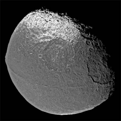 An ancient, 400-kilometer wide (250 miles) impact basin appears just above the center of the disc. The basin is heavily overprinted by more recent, smaller impact craters. The basin rim is delineated by steep scarps that descend to the basin floor. Many of these scarps, as well as walls of nearby craters, appear bright, probably due to exposed outcrops of relatively clean ice. Particularly at mid-latitudes, the brightest scarp exposures appear to face away from the equator (i.e. toward the pole). Often, the opposite south-facing scarps are stained with the lower-brightness material. The most unique, and perhaps most remarkable feature discovered on Iapetus in Cassini images is a topographic ridge that coincides almost exactly with the geographic equator. The ridge is conspicuous in the picture as an approximately 20-kilometer wide (12 miles) band that extends from the western (left) side of the disc almost to the day/night boundary on the right. On the left horizon, the peak of the ridge reaches at least 13 kilometers (8 miles) above the surrounding terrain. Along the roughly 1,300 kilometer (800 mile) length over which it can be traced in this picture, it remains almost exactly parallel to the equator within a couple of degrees. The physical origin of the ridge has yet to be explained. It is not yet clear whether the ridge is a mountain belt that has folded upward, or an extensional crack in the surface through which material from inside Iapetus erupted onto the surface and accumulated locally, forming the ridge. The origin of Cassini Regio is a long-standing debate among scientists. One theory proposes that its dark material may have erupted onto Iapetus's icy surface from the interior. Another theory holds that the dark material represented accumulated debris ejected by impact events on dark, outer satellites of Saturn. Details of this Cassini image mosaic do not definitively rule out either of the theories. However, they do provide important new insights and constraints. The uniform appearance of the dark materials at the equator, the apparent thinning and spottiness of the dark materials at progressively higher latitudes and dark wispy streaks near the distal margin of Cassini Regio strongly suggest that dark material was emplaced as a coating. One of the important new results is that no clear evidence can be found that erupted fluids have resurfaced Cassini Regio. The high density of impact craters argues that the terrain underlying the dark coating is relatively ancient and has not been eradicated by its emplacement. Thus, Cassini Regio may have had its origin in plume-style eruptions in which dark particulate materials accumulated on the surface as fallout, perhaps in conjunction with the creation of the equatorial ridge. On the other hand, the dark deposits in Cassini Regio may be a surface coating consistent with, and perhaps more simply explained by, the fall of dark materials from outside. The view has been oriented so that the north pole is toward the top of the picture. Cassini acquired the images in this mosaic with its narrow angle camera on Dec. 31, 2004, at a distance of about 172,400 kilometers (107,124 miles) from Iapetus and at a Sun-Iapetus-spacecraft, or phase, angle of 50 degrees. The image scale is 1 kilometer (0.6 miles) per pixel. The image has been contrast enhanced to aid visibility of surface features. The Cassini-Huygens mission is a cooperative project of NASA, the European Space Agency and the Italian Space Agency. The Jet Propulsion Laboratory, a division of the California Institute of Technology in Pasadena, manages the mission for NASA's Science Mission Directorate, Washington, D.C. The Cassini orbiter and its two onboard cameras were designed, developed and assembled at JPL. The imaging team is based at the Space Science Institute, Boulder, Colo. |