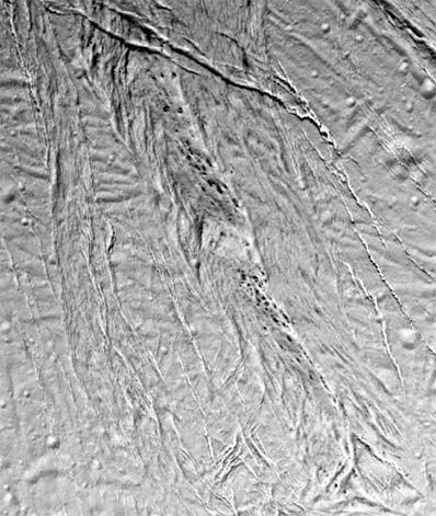 The image shows a variety of tectonic features that attest to Enceladus' dynamic geological history. At the top of the image is a relatively fresh-looking crevasse system with individual fractures more than a kilometer wide. The crevasse system cross-cuts a complex northeast-to-southwest-trending system of older faults. A 12-kilometer-wide (7-mile-wide) band of crudely aligned, chevron-shaped features runs down the center of the image. Among the most intriguing features in this view are a series of dark, small spots, 125 to 750 meters (400 to 2,500 feet) in diameter. The dark spots often seem to be aligned in chains parallel to narrow fractures. The contrast of the dark features with the surrounding bright terrain suggests that they may be compositionally distinct, but their origin is a new mystery. The orientation of the image is such that north is approximately 30 degrees clockwise from the bottom of the frame. Enceladus is 505 kilometers (314 miles) in diameter. The image was taken in visible light with the Cassini spacecraft narrow angle camera on Feb. 17, 2005, at a distance of 21,208 kilometers (13,178 miles) from Enceladus and at a Sun-Enceladus-spacecraft, or phase, angle of 27 degrees. Pixel scale in the image is 125 meters (410 feet) per pixel. The image has been contrast-enhanced to aid visibility. The Cassini-Huygens mission is a cooperative project of NASA, the European Space Agency and the Italian Space Agency. The Jet Propulsion Laboratory, a division of the California Institute of Technology in Pasadena, manages the mission for NASA's Science Mission Directorate, Washington, D.C. The Cassini orbiter and its two onboard cameras were designed, developed and assembled at JPL. The imaging team is based at the Space Science Institute, Boulder, Colo. |