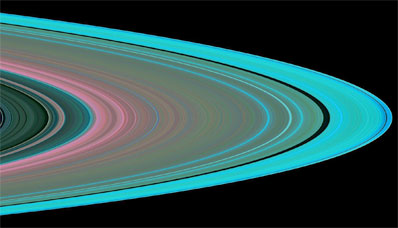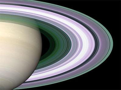 Note the gradual increase in shades of green towards the outer edge of ring A. It indicates gradual increase in the abundance of 5-centimeter (2-inch) and smaller particles. Note also the blue shades in the vicinity of the Keeler gap (the narrow dark band near the edge of ring A). They indicate increased abundance of even smaller particles of diameter less than a centimeter. Frequent collisions between large ring particles in this dynamically active region likely fragment the larger particles into more numerous smaller ones. Credit: NASA/JPL Download larger image version here