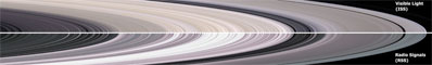 This image compares the structure of Saturn's rings observed by two approaches. The upper half is a natural color mosaic of images by the Cassini narrow-angle camera. The bottom simulated images is constructed from a radio occultation observation conducted on May 3, 2005. Color in the lower image is used to represent information about ring particle sizes. Credit: NASA/JPL Download larger image version here