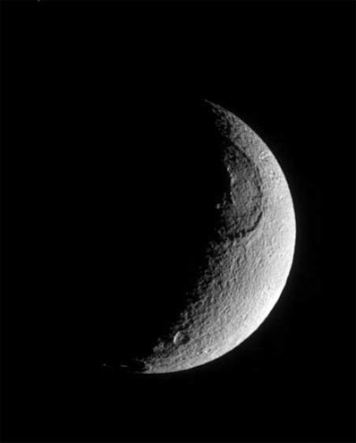 North on Tethys is up in this view. The lit portion of Tethys seen here is on the moon's leading hemisphere as it orbits Saturn.