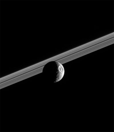 Impact-battered Mimas steps in front of Saturn's rings, showing off its giant 130-kilometer (80-mile) wide crater Herschel.