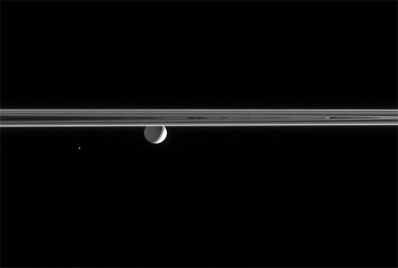 Gazing across the ringplane, the Cassini spacecraft spots a Saturn-lit Mimas and the tiny Trojan moon Helene. Only the bright crescent on Mimas' eastern limb is lit by the Sun; the moon's night side is illuminated by Saturnshine, or "greylight" as it is called by imaging scientists.