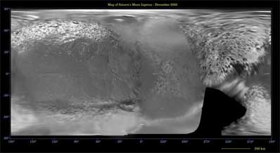 Some territory seen in this map was imaged by Cassini using reflected light from Saturn.