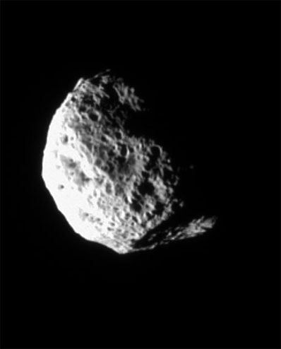 The image was taken in visible light with the Cassini spacecraft narrow-angle camera on Dec. 23, 2005 at a distance of 228,000 kilometers (142,000 miles) from Hyperion and at a Sun-Hyperion-spacecraft, or phase, angle of 77 degrees. Resolution in the original image was about 1.4 kilometers (0.9 mile) per pixel. The image was magnified by a factor of two and contrast-enhanced to aid visibility.