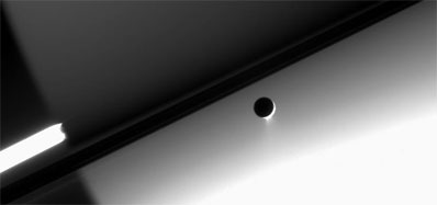 Enceladus (505 kilometers, or 314 miles across) is seen here against the night side of Saturn. The extended exposure time used to image the plumes also makes the southern hemisphere, illuminated by ring-shine, appear bright.