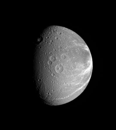 Lit terrain in this view is on the Saturn-facing hemisphere of Dione (1,126 kilometers, or 700 miles across). North is up and rotated eight degrees to the left.