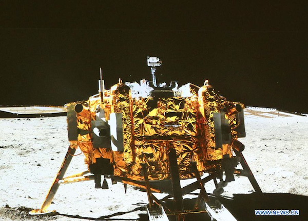 Adorned with a Chinese flag, the Yutu rover appeared in imagery taken by a camera mounted on the Chang'e 3 mission's stationary lander, which touched down on the moon Saturday at 1311:18 GMT (8:11:18 a.m. EST).