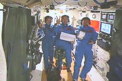 The Shenzhou 9 astronauts rode their spacecraft to an automated docking with the Tiangong space lab Monday, two days after lifting off from northwest China atop a Long March rocket.. The crew has worked worked inside the module for more than five days, conducting engineering tests of the bus-sized laboratory and completing a series of medical experiments, according to Chinese space officials. The crew is commanded by Jing Haipeng, a veteran of a previous spaceflight. Liu Yang, China's first female space flier, and pilot Liu Wang round out the crew. The astronauts have also exchanged messages with their families on Earth since they arrived at Tiangong 1, according to the state-run Xinhua news agency. A spokesperson with the China Manned Space Engineering Office said the astronauts were in good condition and all systems were operating normally. China released video of Liu Yang riding a stationary exercise bike inside the Tiangong 1 module. Liu Wang took manual control of the lab's attitude control system, testing his ability to control the orientation of the 60-foot-long docked complex of Shenzhou 9 and Tiangong 1. Liu Wang and Jing Haipeng simulated the piloted docking procedure more than 1,500 times before launch, according to Wu Ping, a spokesperson for China's manned space program.