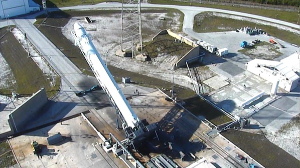 Falcon 9 rocket moves to launch pad SPACEFLIGHT NOW Posted: December 3, 2010 SpaceX released these photos of the Falcon 9 rocket as it rolled out of its hangar and was hoisted vertically atop Complex 40 Thursday. The 154-foot-tall rocket is scheduled to undergo a countdown rehearsal and engine test firing Friday before liftoff Dec. 7. Credit: SpaceX