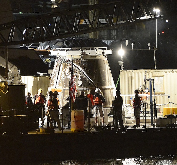 Five days after splashdown in the Pacific Ocean west of Baja California, SpaceX's Dragon spacecraft arrived at the Port of Los Angeles early Tuesday aboard a recovery barge. Workers lifted the capsule from the ship to a trailer for transport to SpaceX's test facility in McGregor, Texas.