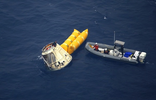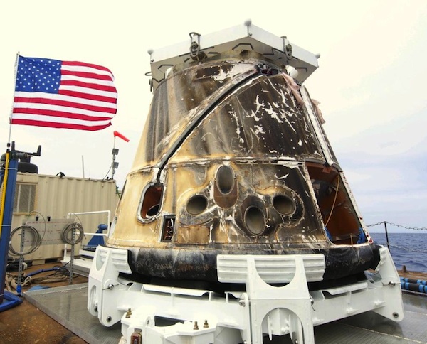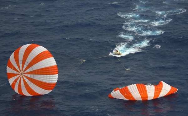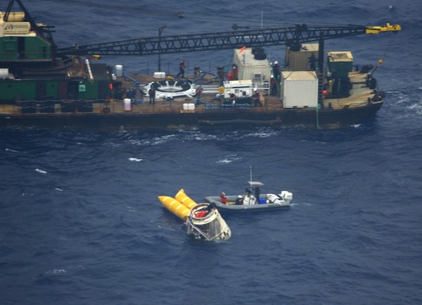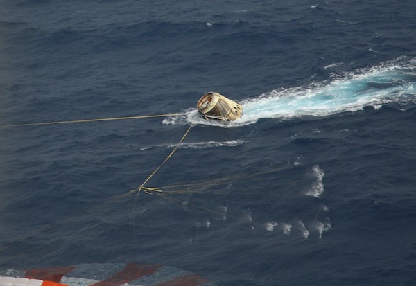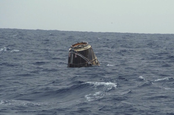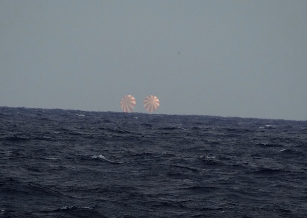 SpaceX's Dragon spacecraft is recovered in the Pacific Ocean about 560 miles west of Baja California following splashdown at 1542 GMT (11:42 a.m. EDT; 8:42 a.m. Pacific time).