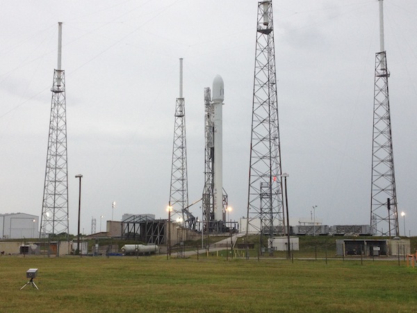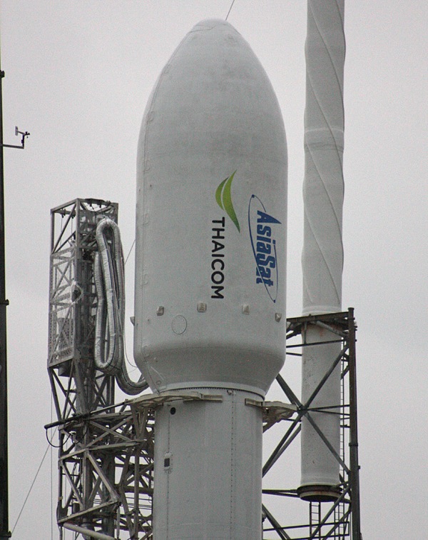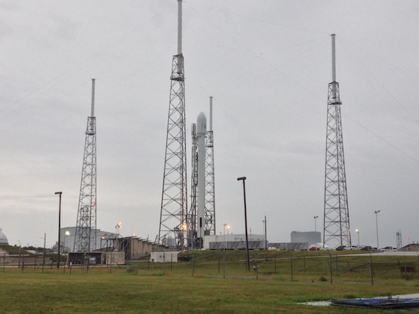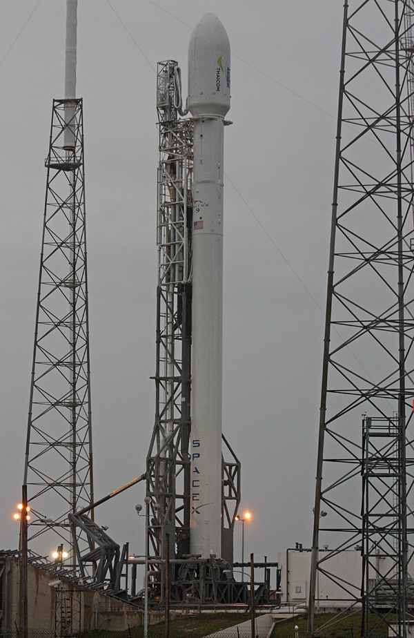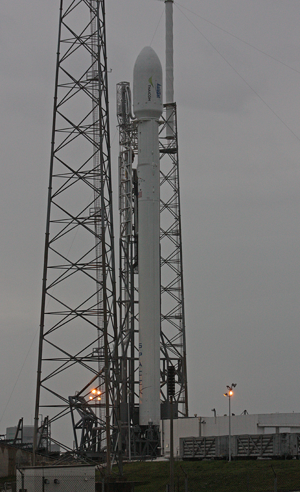 Gray skies and rain showers hung over SpaceX's launch pad at Cape Canaveral on Saturday as ground crews readied a Falcon 9 rocket for a middle-of-the-night liftoff with the AsiaSat 6 communications satellite.