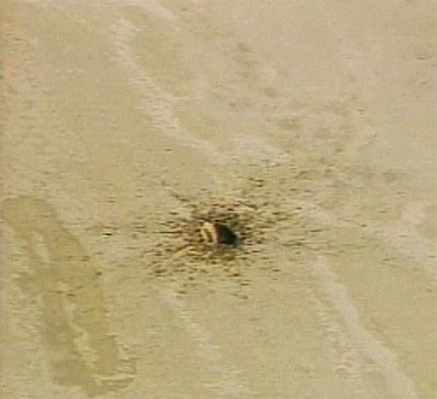 AERIAL VIEWS OF CAPSULE HALF BURIED IN IMPACT CRATER QT